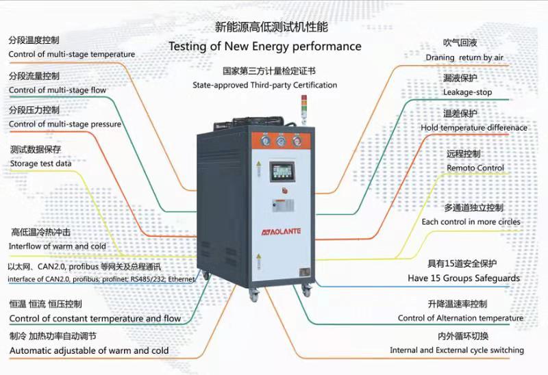 深圳奧蘭特機(jī)械開發(fā)的新能源汽車動力電池液冷測試系統(tǒng)、動力電池包深度冷熱沖擊試驗機(jī)溫度控制范圍-60~110℃,流量2-100L/min,壓力恒定0~400Kpa;控溫精度:±0.1℃,壓力控制精度±0.1L。控制精度都由國際第三方檢測機(jī)構(gòu)出具證書。